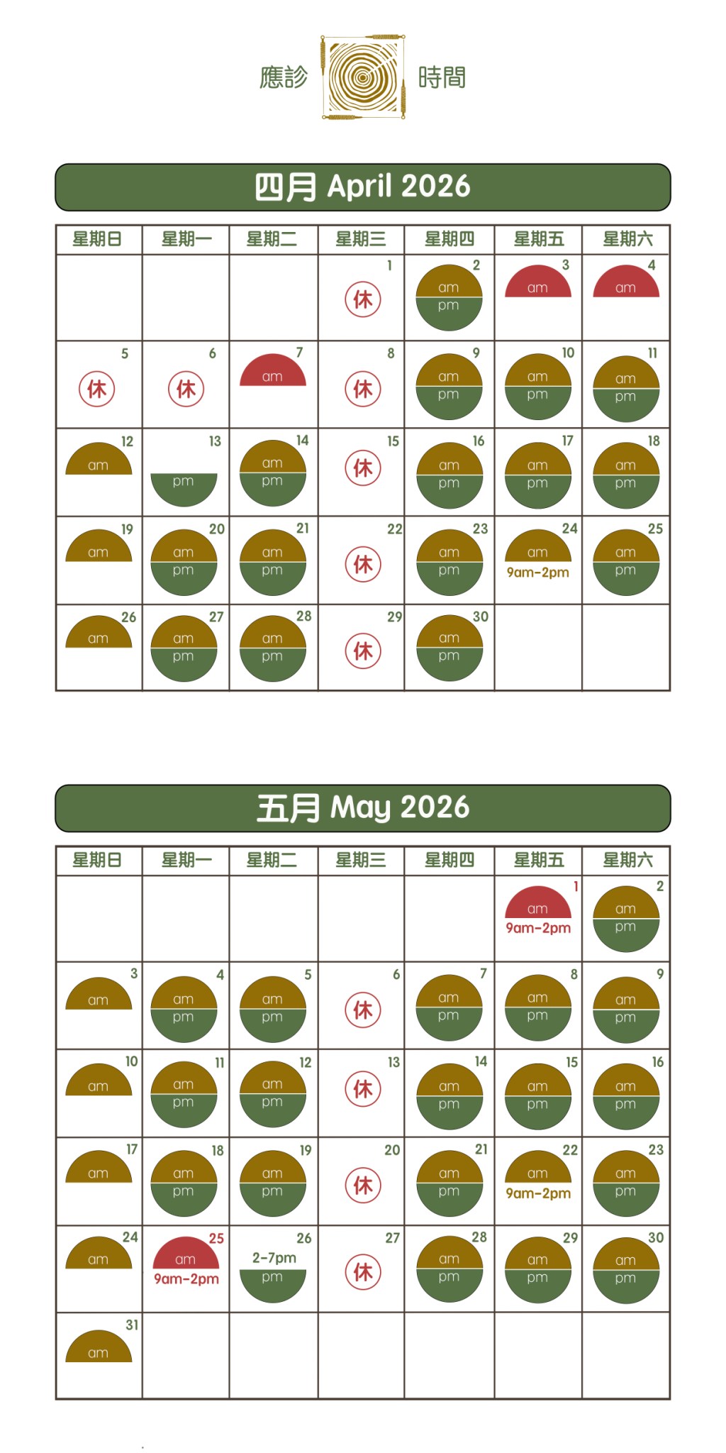 2026年4月特別應診安排: 13/4(一) : 2pm – 7pm | 24/4(五) : 9am -2pm 2026年5月特別應診安排: 22/5(五) : 9am – 2pm | 26/5(二) : 2pm -7pm